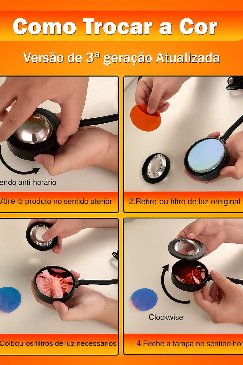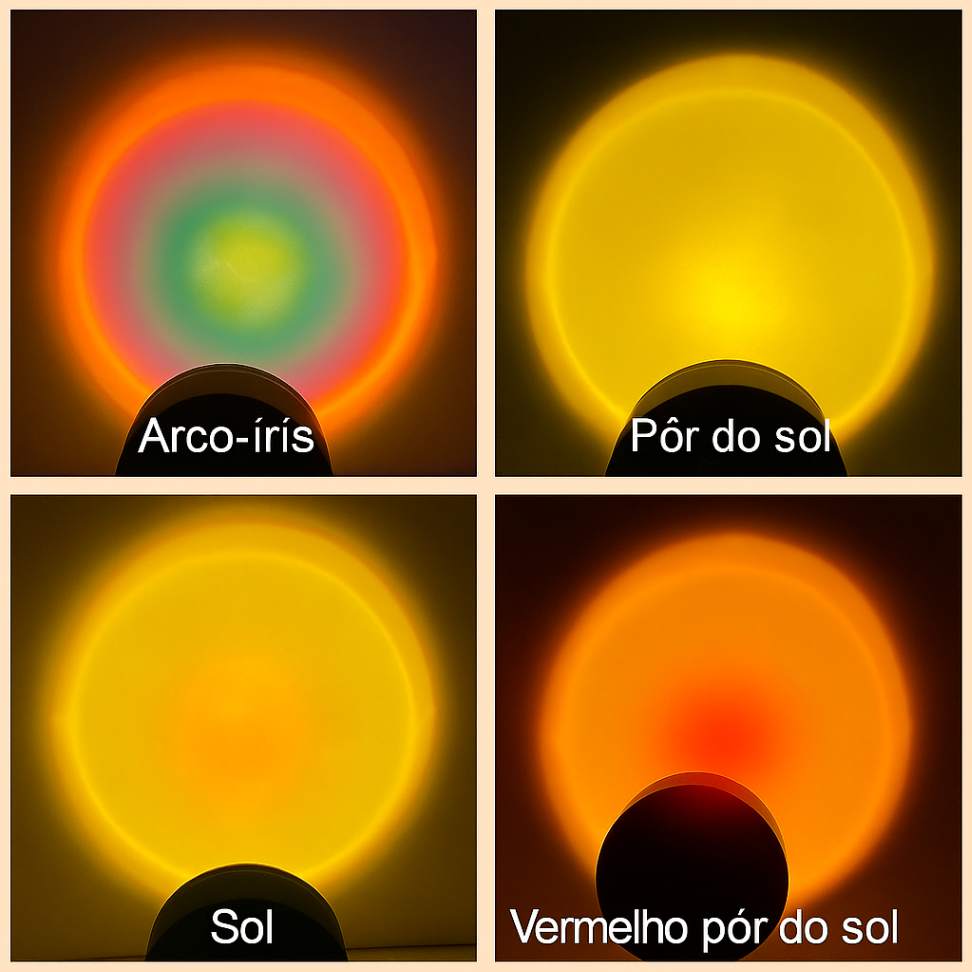 Transforme o clima do seu espaço com a Luminária LED Pôr do Sol 3ª Geração, o projetor que cria uma atmosfera romântica e moderna inspirada nas cores do pôr do sol natural. Ideal para decoração, fotos e momentos especiais, ela é a queridinha das redes sociais!
